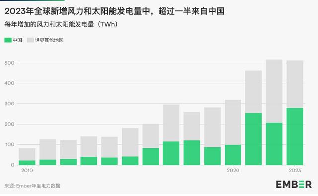 Ember高級電力政策分析師楊木易告訴澎湃新聞(www.thepaper.cn),目前,大部分風(fēng)光發(fā)電集中在中國和發(fā)達經(jīng)濟體。特別值得一提的是,中國在2023年對全球風(fēng)電和太陽能發(fā)電增長作出了巨大的貢獻。其新增太陽能發(fā)電占全球總量的51%,新增風(fēng)能占比更是達到60%。未來幾年中國的太陽能和風(fēng)能容量以及電力發(fā)電量增長將保持較高水平。