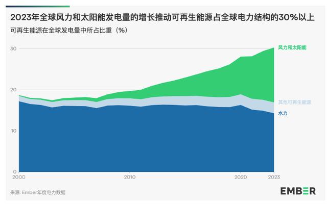 5月8日,根據(jù)全球能源智庫Ember的最新報告:2023 年,得益于太陽能和風(fēng)力發(fā)電量的增長,可再生能源發(fā)電量在全球發(fā)電量中的占比達到了前所未有的30%。2023年或?qū)⒊蔀殡娏π袠I(yè)碳排放量達到峰值的標志性轉(zhuǎn)折點。