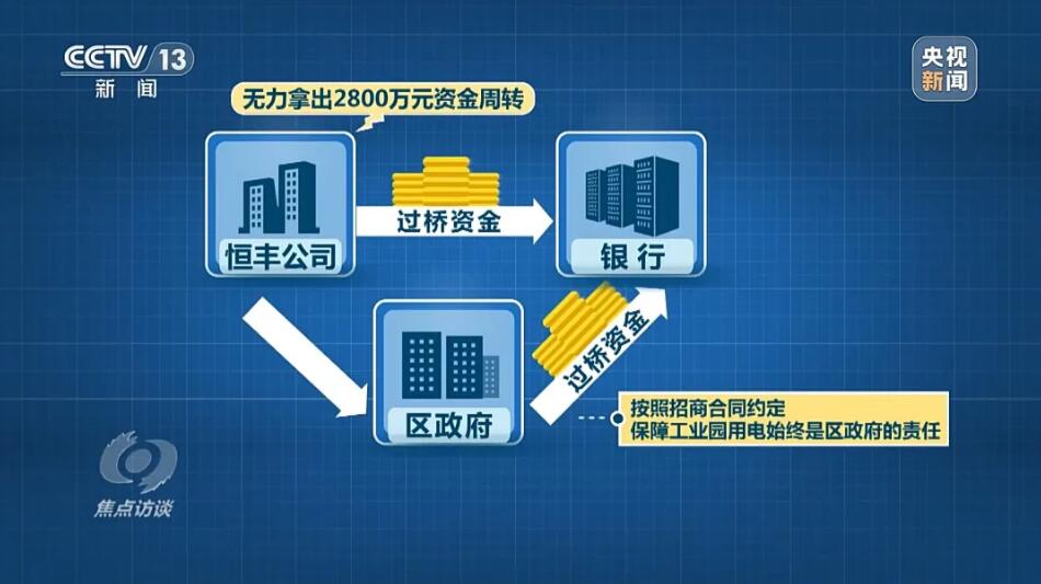 而為了解押,恒豐公司需要提供一筆過橋資金給抵押貸款的銀行,待土地分割手續(xù)辦完后,銀行再繼續(xù)發(fā)放貸款。這時候,恒豐公司由于長期沒有正式生產(chǎn),無力拿出2800萬元資金周轉(zhuǎn),請區(qū)政府協(xié)調(diào)一筆過橋資金,因為按照招商合同約定,保障工業(yè)園用電始終是區(qū)政府的責(zé)任。
