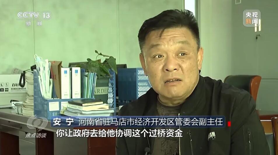 河南省駐馬店市經(jīng)濟開發(fā)區(qū)管委會副主任安寧:過橋資金2800萬,他自己拿不起,讓政府協(xié)調(diào)過橋資金,政府又為了免于擔(dān)風(fēng)險,幾經(jīng)努力,最后這個事沒有做成。說是為了免擔(dān)風(fēng)險,區(qū)政府沒有幫助協(xié)調(diào)下過橋資金,但是,也沒有履行確保恒豐公司用電負荷的約定。當(dāng)?shù)亟o產(chǎn)業(yè)園提供的一直是建設(shè)廠房時的臨時用電,220千伏變電站沒有如期建成,對企業(yè)造成的影響,當(dāng)?shù)卣质侨绾慰创哪?河南省駐馬店市經(jīng)濟開發(fā)區(qū)管委會副主任安寧:電力接上了,是臨時用電,建設(shè)期都給接了。記者:電力保障在前,還是應(yīng)該生產(chǎn)在前?河南省駐馬店市經(jīng)濟開發(fā)區(qū)管委會副主任安寧:電力保障在前。記者:正式用電的電力保障一直沒有進行的原因是什么呢?河南省駐馬店市經(jīng)濟開發(fā)區(qū)管委會副主任安寧:這個你要問當(dāng)事人。