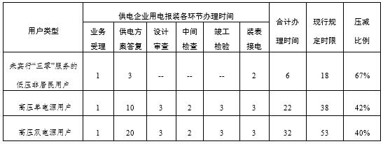 2. 對(duì)于居民用戶(hù)和實(shí)行“三零”服務(wù)的低壓非居民用戶(hù),用電報(bào)裝壓減為受理簽約、施工接電2個(gè)環(huán)節(jié),在工作目標(biāo)中已規(guī)定全過(guò)程辦理時(shí)間。