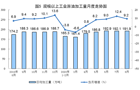 原油生產加快,加工有所放緩。8月份,生產原油1665萬噸,同比增長2.3%,增速比上月加快1.7個百分點;加工原油5947萬噸,增長9.2%,比上月放緩3.2個百分點。1—8月份,生產原油13015萬噸,同比增長1.5%;加工原油4.4億噸,同比增長3.2%。