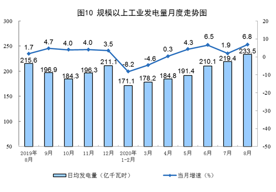 電力生產較快增長。8月份,發(fā)電量7238億千瓦時,同比增長6.8%,增速比上月加快4.9個百分點;日均發(fā)電量233.5億千瓦時,環(huán)比增加14.1億千瓦時。1—8月份,發(fā)電量47728億千瓦時,同比增長0.3%。