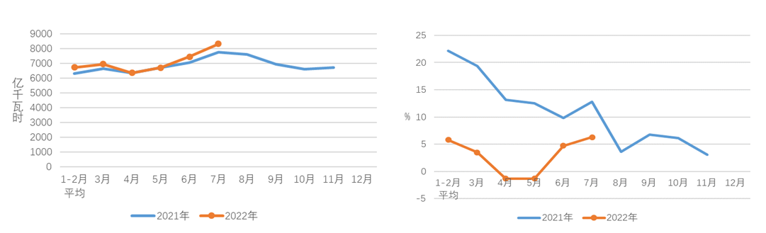 圖1 2021、2022年分月全社會(huì)用電量及其增速