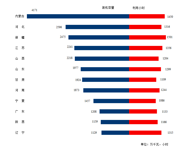 圖3 1-7月份風(fēng)電裝機(jī)較多省份風(fēng)電裝機(jī)容量和設(shè)備利用小時(shí)