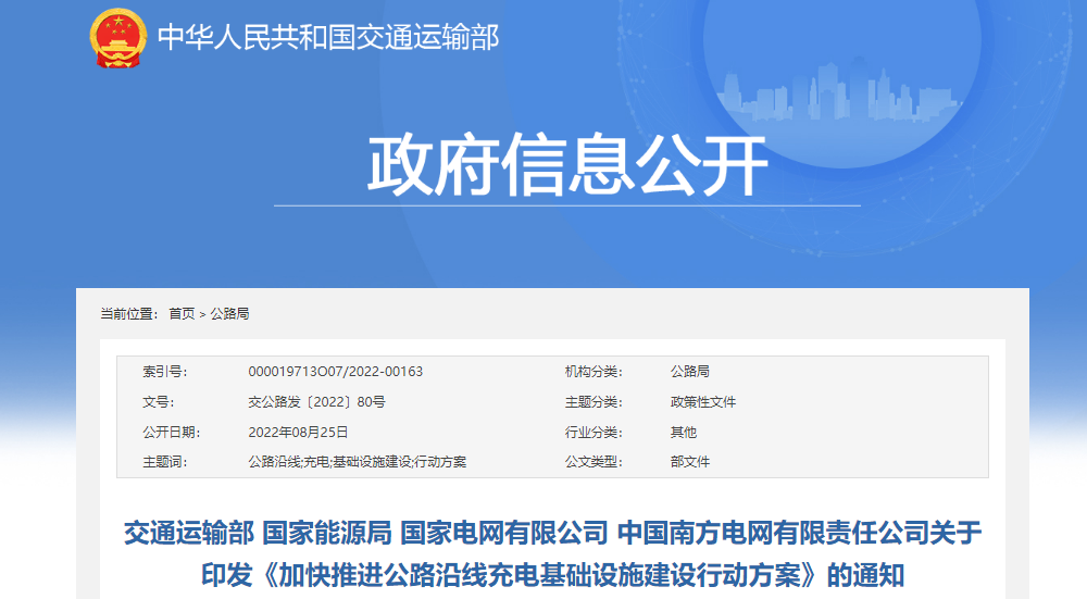 交通運輸部 國家能源局 國家電網(wǎng)有限公司 中國南方電網(wǎng)有限責(zé)任公司關(guān)于印發(fā)《加快推進公路沿線充電基礎(chǔ)設(shè)施建設(shè)行動方案》的通知