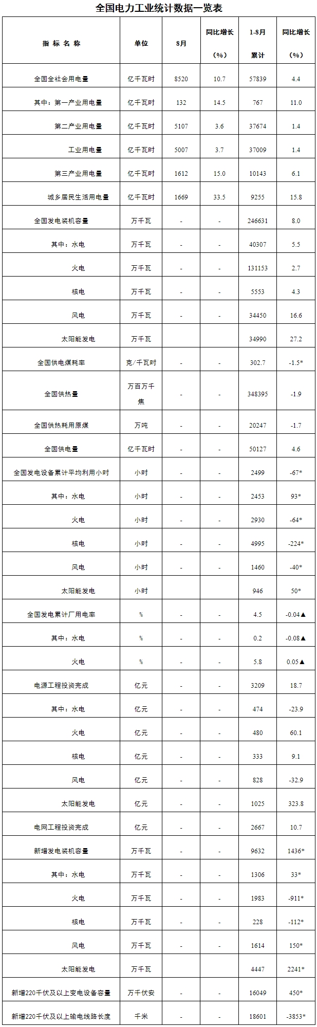 注:1.全社會(huì)用電量為全口徑數(shù)據(jù),全國(guó)供電量為調(diào)度口徑數(shù)據(jù)。2.“同比增長(zhǎng)”列中,標(biāo)*的指標(biāo)為絕對(duì)量;標(biāo)▲的指標(biāo)為百分點(diǎn)。