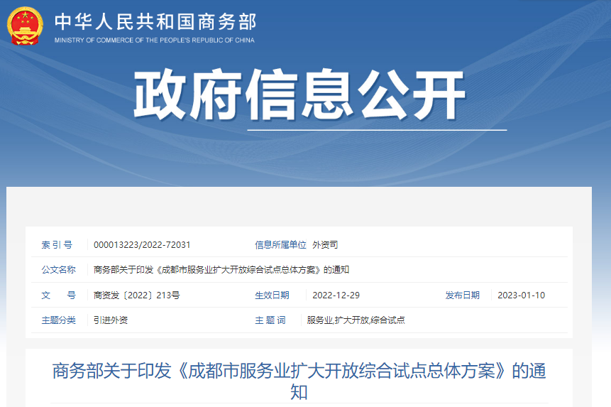 商務(wù)部關(guān)于印發(fā)《成都市服務(wù)業(yè)擴(kuò)大開放綜合試點(diǎn)總體方案》的通知