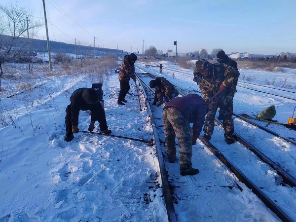 “冬天氣溫低,線路容易出現(xiàn)問題,這對行車安全極為不利,這些故障都需要及時(shí)進(jìn)行處理。比如,連接鋼軌的魚尾板容易出現(xiàn)斷裂,因?yàn)闊崦浝淇s軌縫變大,更換一個(gè)就要將近1個(gè)小時(shí)時(shí)間。大冬天我們要趴在冰天雪地里進(jìn)行處理,不管穿多厚的衣服也會被凍得透透的。”劉檢閱一邊趴在線路上查看魚尾板的狀況一邊說。