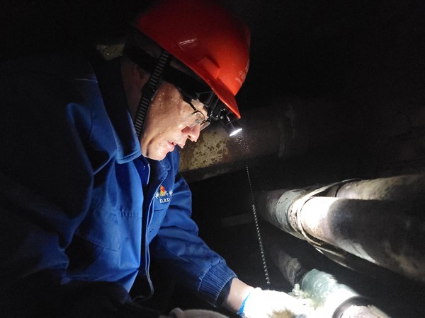 當(dāng)張軍和巡檢員來到問題所在位置,發(fā)現(xiàn)霧氣正從井蓋中上升,井蓋上結(jié)了一層白霜。張軍判斷,應(yīng)該是二網(wǎng)管道有漏點(diǎn)。經(jīng)過通風(fēng)、檢測程序,達(dá)到下井作業(yè)要求后,他率先下井查看。