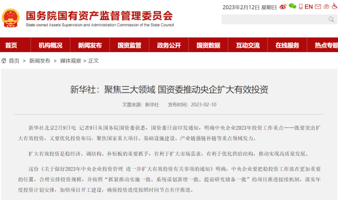日前,國務(wù)院國資委印發(fā)《關(guān)于做好2023年中央企業(yè)投資管理 進一步擴大有效投資有關(guān)事項的通知》(以下簡稱《通知》),明確中央企業(yè)2023年投資工作三大重點領(lǐng)域:國家重大項目、基礎(chǔ)設(shè)施建設(shè)、產(chǎn)業(yè)鏈強鏈補鏈。