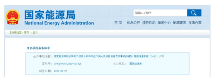 3月9日,國家能源局發(fā)布的《關(guān)于按月公布和報(bào)送戶用光伏項(xiàng)目信息有關(guān)事項(xiàng)的通知》。