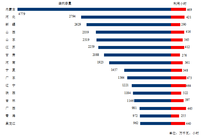 圖3 1-2月份風電裝機較多省份風電裝機容量和設備利用小時