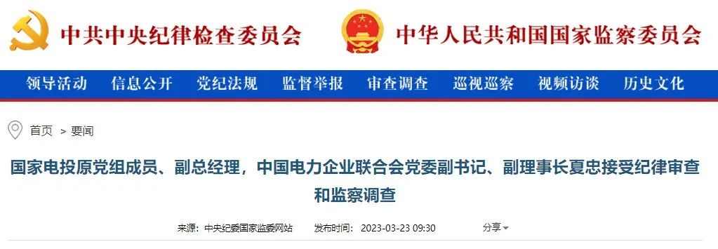 中央紀委國家監(jiān)委網(wǎng)站3月23日消息,國家電投原黨組成員、副總經(jīng)理,中國電力企業(yè)聯(lián)合會黨委副書記、副理事長夏忠涉嫌嚴重違紀違法,目前正接受中央紀委國家監(jiān)委駐國務(wù)院國資委紀檢監(jiān)察組和遼寧省盤錦市監(jiān)委紀律審查和監(jiān)察調(diào)查。