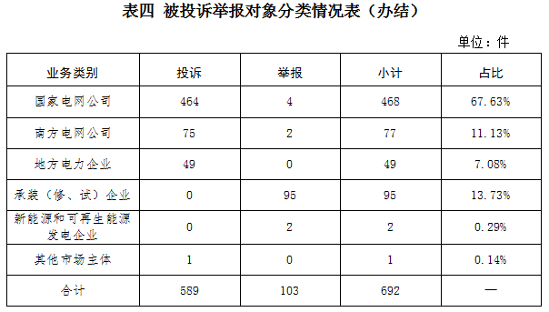 從被投訴舉報(bào)對象看,供電企業(yè)594件、占投訴舉報(bào)總數(shù)的85.84%,其中國家電網(wǎng)公司468件、占比67.63%,南方電網(wǎng)公司77件、占比11.13%,地方電力企業(yè)49件、占比7.08%;承裝(修、試)電力設(shè)施施工企業(yè)95件、占比13.73%;新能源和可再生能源發(fā)電企業(yè)2件、占比0.29%;其他市場主體1件、占比0.14%。