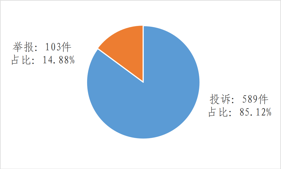 2023年6月,12398熱線共接收投訴舉報(bào)942件,環(huán)比增長19.85%、同比下降34.76%。其中:投訴810件,環(huán)比增長17.39%、同比下降41.39%;舉報(bào)132件,環(huán)比增長37.50%、同比增長112.90%。