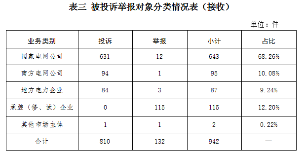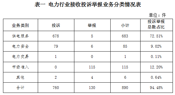 電力行業(yè)排在首位,數(shù)量為890件、占投訴舉報(bào)總數(shù)的94.48%,主要集中在供電服務(wù)、市場準(zhǔn)入、電力安全等方面。