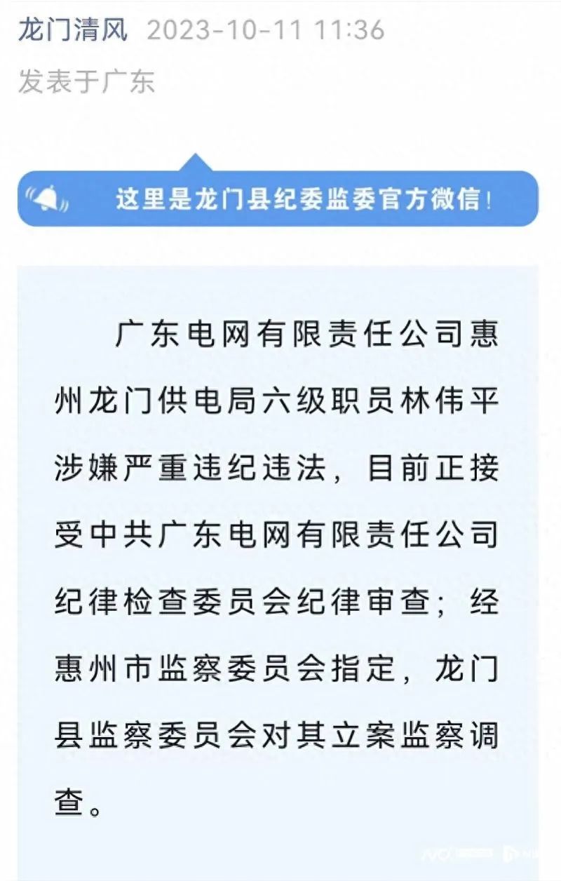 廣東電網(wǎng)有限責(zé)任公司惠州龍門供電局六級職員林偉平涉嫌嚴重違紀違法,目前正接受中共廣東電網(wǎng)有限責(zé)任公司紀律檢查委員會紀律審查,經(jīng)惠州市監(jiān)察委員會指定,龍門縣監(jiān)察委員會對其立案監(jiān)察調(diào)查。