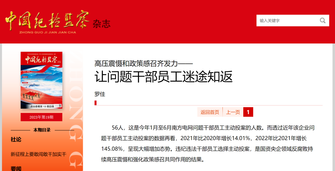 最新一期《中國紀檢監(jiān)察》雜志刊發(fā)了《高壓震懾和政策感召齊發(fā)力—— 讓問題干部員工迷途知返》一文,文中透露,今年1月至6月,南方電網(wǎng)共有56名問題干部員工主動“投案”。