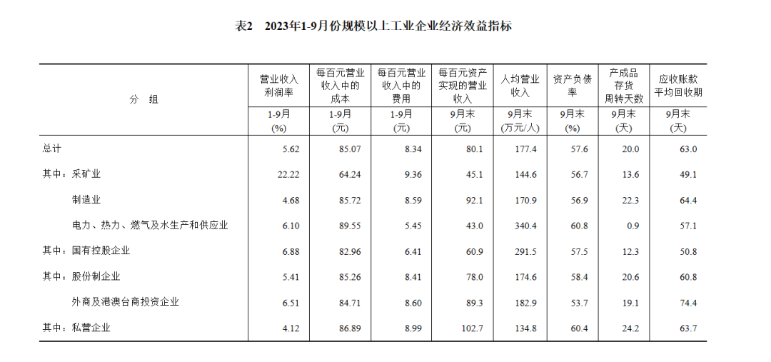 9月末,規(guī)模以上工業(yè)企業(yè)每百元資產(chǎn)實現(xiàn)的營業(yè)收入為80.1元,同比減少5.8元;人均營業(yè)收入為177.4萬元,同比增加6.0萬元;產(chǎn)成品存貨周轉(zhuǎn)天數(shù)為20.0天,同比增加1.2天;應(yīng)收賬款平均回收期為63.0天,同比增加5.9天。