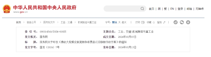 3月13日,國(guó)務(wù)院印發(fā)《推動(dòng)大規(guī)模設(shè)備更新和消費(fèi)品以舊換新行動(dòng)方案》(以下簡(jiǎn)稱《行動(dòng)方案》)。