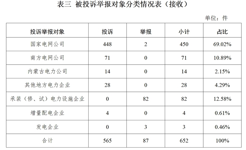 供電企業(yè)567件、占投訴舉報總數(shù)的86.96%,其中:國家電網(wǎng)公司450件、占投訴舉報總數(shù)的69.02%,南方電網(wǎng)公司71件、占投訴舉報總數(shù)的10.89%,內(nèi)蒙古電力公司14件、占投訴舉報總數(shù)的2.15%,其他地方電力企業(yè)28件、占投訴舉報總數(shù)的4.29%,增量配電企業(yè)4件,占投訴舉報總數(shù)的0.61%;承裝(修、試)電力設(shè)施企業(yè)82件、占投訴舉報總數(shù)的12.58%;發(fā)電企業(yè)3件、占投訴舉報總數(shù)的0.46%。