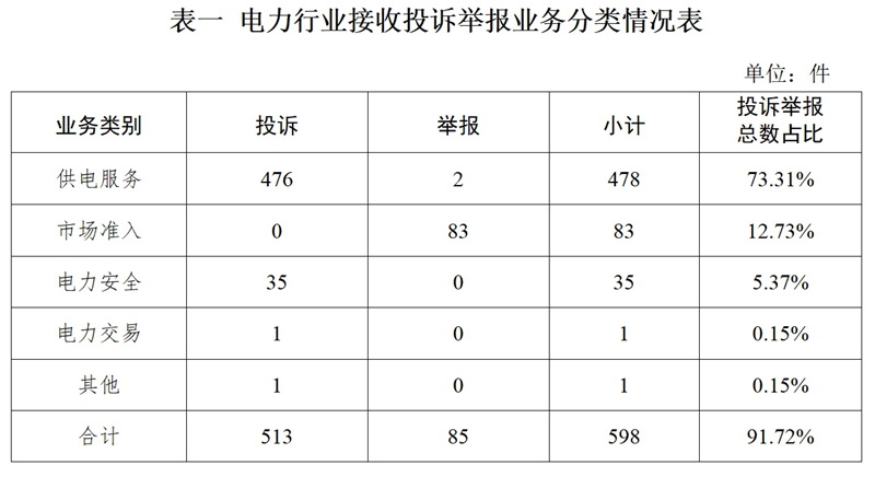 電力行業(yè)排在首位,數(shù)量為598件、占投訴舉報總數(shù)的91.72%,主要集中在供電服務(wù)、市場準(zhǔn)入、電力安全等方面。