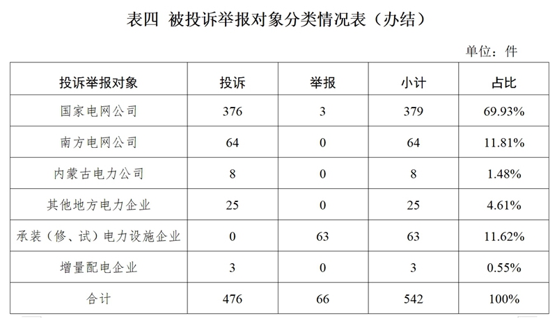 從被投訴舉報對象看,供電企業(yè)478件、占投訴舉報總數(shù)的88.37%,其中:國家電網(wǎng)公司379件、占比69.93%;南方電網(wǎng)公司64件、占比11.81%;內(nèi)蒙古電力公司8件、占比1.48%;其他地方電力企業(yè)25件、占比4.61%;承裝(修、試)電力設(shè)施企業(yè)63件、占比11.62%;增量配電企業(yè)3件、占比0.55%。
