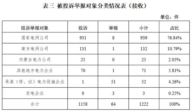 供電企業(yè)1167件、占投訴舉報總數(shù)的95.49%,其中:國家電網(wǎng)公司939件、占投訴舉報總數(shù)的76.84%,南方電網(wǎng)公司132件、占投訴舉報總數(shù)的10.79%,內(nèi)蒙古電力公司25件、占投訴舉報總數(shù)的2.05%,其他地方電力企業(yè)71件、占投訴舉報總數(shù)的5.81%;發(fā)電企業(yè)3件,占投訴舉報總數(shù)的0.25%;承裝(修、試)電力設(shè)施企業(yè)52件、占投訴舉報總數(shù)的4.26%。