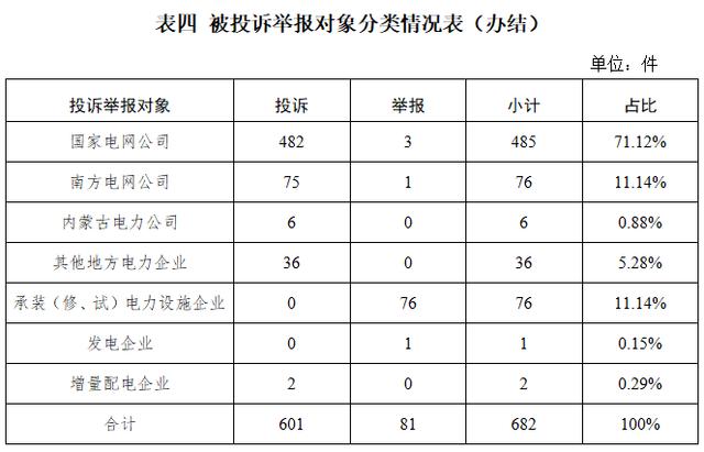 從被投訴舉報對象看,供電企業(yè)603件、占投訴舉報總數(shù)的88.42%,其中:國家電網(wǎng)公司485件、占比71.12%;南方電網(wǎng)公司76件、占比11.14%;內(nèi)蒙古電力公司6件、占比0.88%;其他地方電力企業(yè)36件、占比5.28%。承裝(修、試)電力設(shè)施企業(yè)76件、占比11.14%;發(fā)電企業(yè)1件、占比0.15%;增量配電企業(yè)2件、占比0.29%。