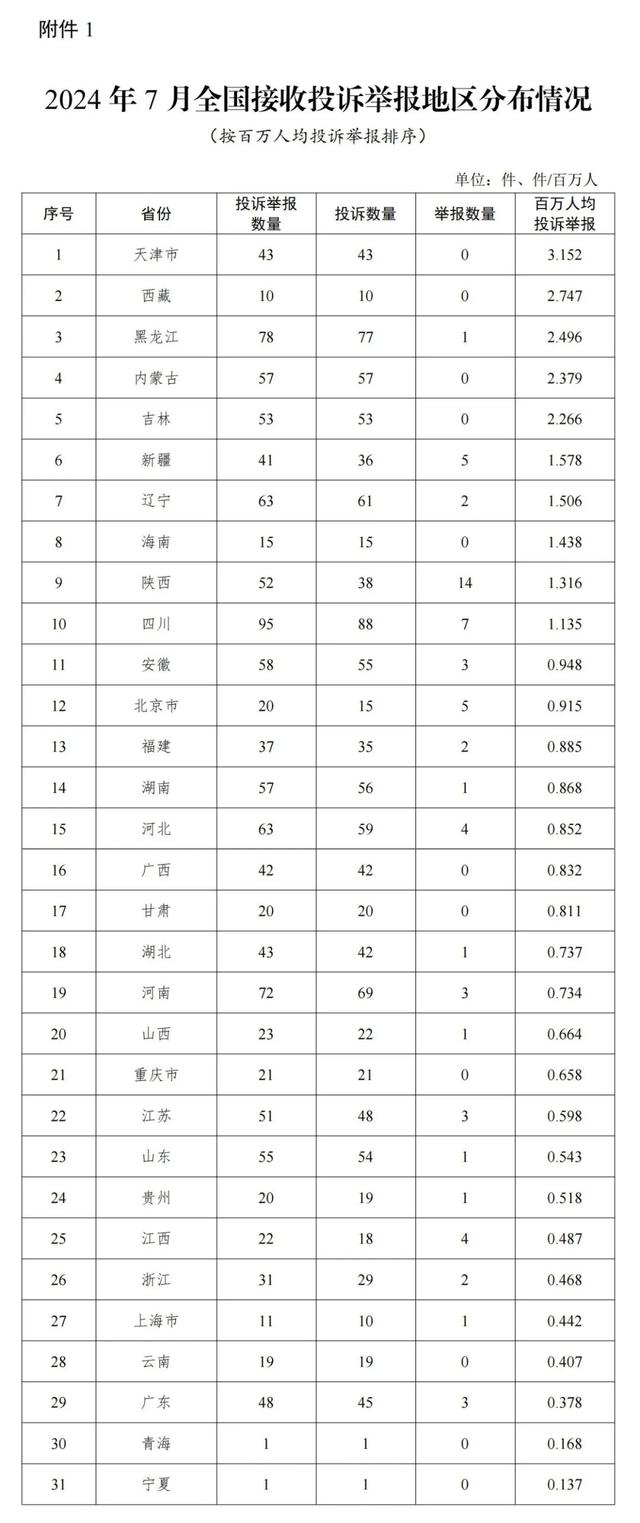 各省(自治區(qū)、直轄市)按照接收投訴舉報數(shù)量排序,四川、黑龍江、河南、遼寧、安徽排在全國前5位。按百萬人均投訴舉報數(shù)量排序,天津、西藏、黑龍江、內(nèi)蒙古、吉林排在全國前5位。(2024年7月全國接收投訴舉報地區(qū)分布情況,見附件1)