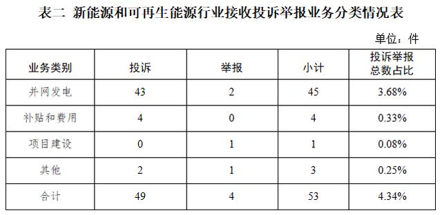 新能源和可再生能源行業(yè)排在第二位,數(shù)量為53件、占投訴舉報總數(shù)的4.34%,主要集中在并網(wǎng)發(fā)電方面。