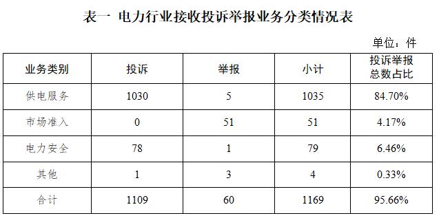 電力行業(yè)排在首位,數(shù)量為1169件、占投訴舉報總數(shù)的95.66%,主要集中在供電服務、電力安全、市場準入等方面。