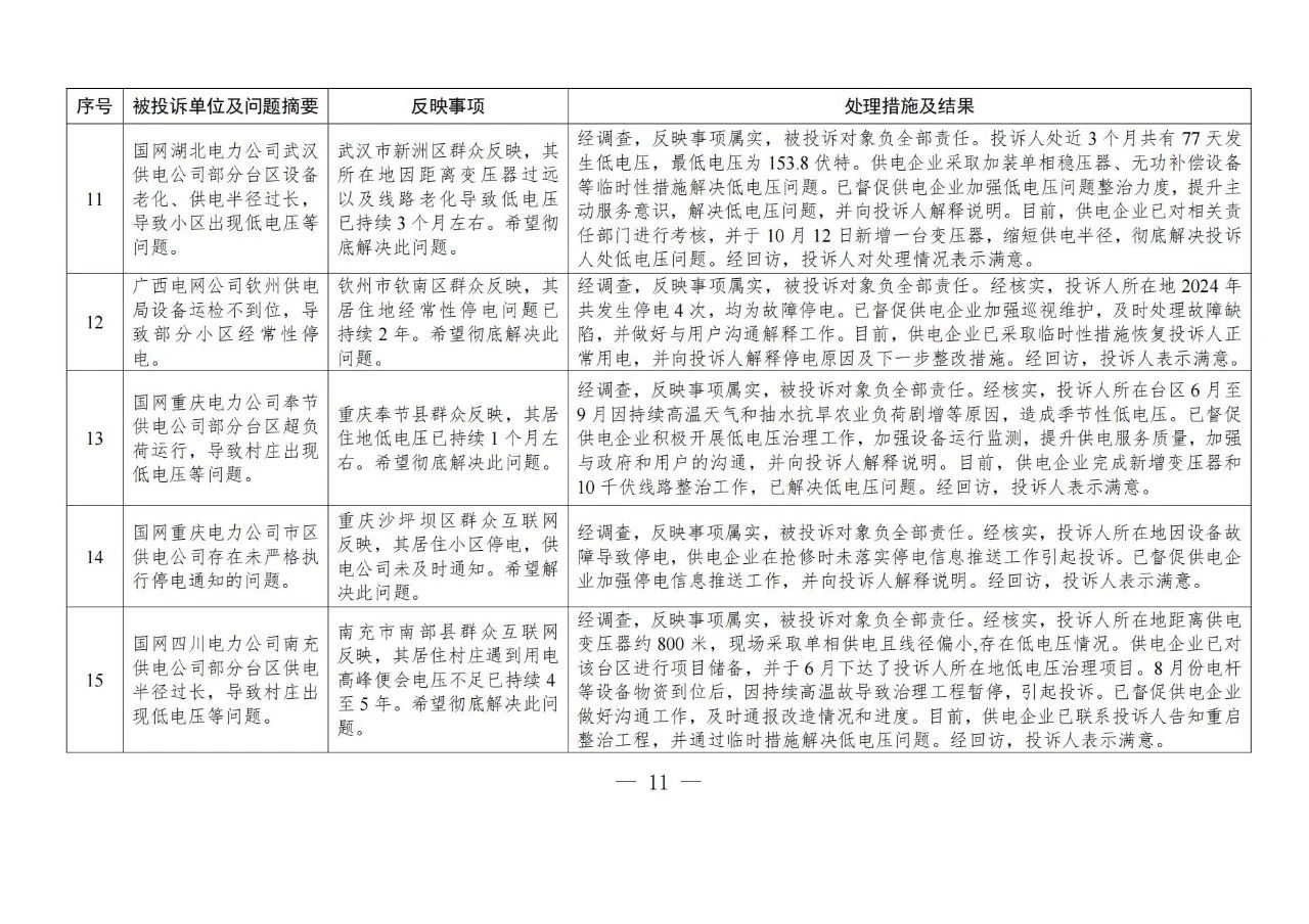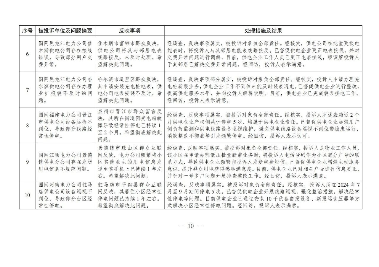 針對群眾反映的投訴舉報,國家能源局派出機構(gòu)嚴格按照有關(guān)法規(guī)政策規(guī)定進行處理。一是督促供電企業(yè)進一步規(guī)范用電報裝管理,強化業(yè)擴報裝全流程管控,嚴格按照規(guī)定時限完成裝表接電;二是要求供電企業(yè)加強設(shè)備隱患排查整治,強化停電搶修管理,合理規(guī)劃計劃停電,增加搶修資源投入,提升設(shè)備管控和停電搶修能力,切實提高供電可靠性;三是通過行政處罰、監(jiān)管約談、責(zé)令整改等方式,糾正有關(guān)企業(yè)違法違規(guī)行為,維護公平公正的市場秩序和群眾合法權(quán)益;四是通過解釋說明、澄清事實,消除群眾誤解。(2024年11月12398熱線典型投訴舉報事項具體處理情況見附件2)