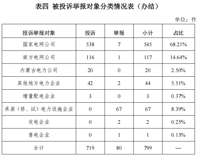 從被投訴舉報對象看,供電企業(yè)719件、占投訴舉報總數(shù)的89.99%,其中國家電網(wǎng)公司545件、占比68.21%,南方電網(wǎng)公司117件、占比14.64%,內(nèi)蒙古電力公司20件、占比2.50%,其他地方電力企業(yè)44件、占比5.51%,增量配電企業(yè)3件、占比0.37%;承裝(修、試)電力設(shè)施企業(yè)67件、占比8.39%;發(fā)電企業(yè)2件、占比0.25%;電力交易機構(gòu)1件、占比0.13%。