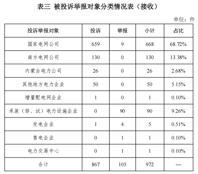 供電企業(yè)875件、占投訴舉報總數(shù)的90.02%,其中國家電網(wǎng)公司668件、占投訴舉報總數(shù)的68.72%,南方電網(wǎng)公司130件、占投訴舉報總數(shù)的13.37%,內(nèi)蒙古電力公司26件、占投訴舉報總數(shù)的2.67%,其他地方電力企業(yè)50件、占投訴舉報總數(shù)的5.14%,增量配電網(wǎng)企業(yè)1件、占投訴舉報總數(shù)的0.10%;承裝(修、試)電力設(shè)施企業(yè)90件、占投訴舉報總數(shù)的9.26%;發(fā)電企業(yè)5件,占投訴舉報總數(shù)的0.51%;售電企業(yè)1件、占投訴舉報總數(shù)的0.1%;電力交易中心1件、占投訴舉報總數(shù)的0.1%。