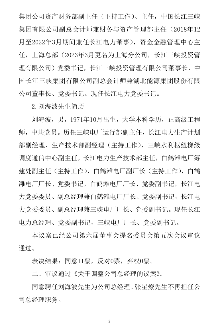 根據《公司法》《公司章程》等有關規(guī)定,經公司控股股東中國長江三峽集團有限公司推薦、董事會提名委員會審核,董事會同意提名劉姿女士為公司董事候選人,任期自股東大會審議通過之日起至第二屆董事會任期屆滿之日止;該事項尚需提交公司股東大會審議。經公司董事長提名、董事會提名委員會審核,董事會同意聘任劉姿女士為公司總經理,任期自本次董事會審議通過之日起至第二屆董事會任期屆滿之日止。