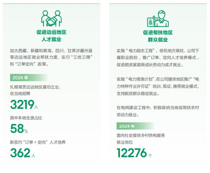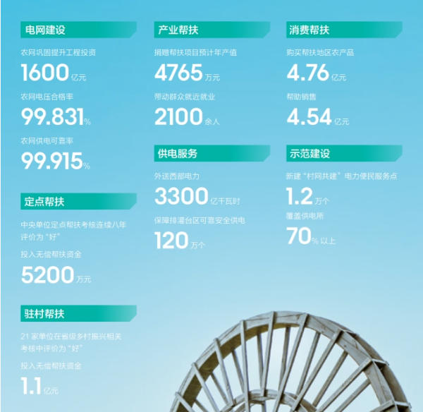農(nóng)網(wǎng)鞏固提升工程投資1600億元,農(nóng)網(wǎng)電壓合格率99.831%,農(nóng)網(wǎng)供電可靠率99.915%;捐贈(zèng)幫扶項(xiàng)目預(yù)計(jì)年產(chǎn)值4765萬(wàn)元,帶動(dòng)群眾就近就業(yè)2100余人;投入無(wú)償幫扶資金1.1億元。