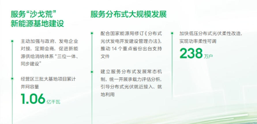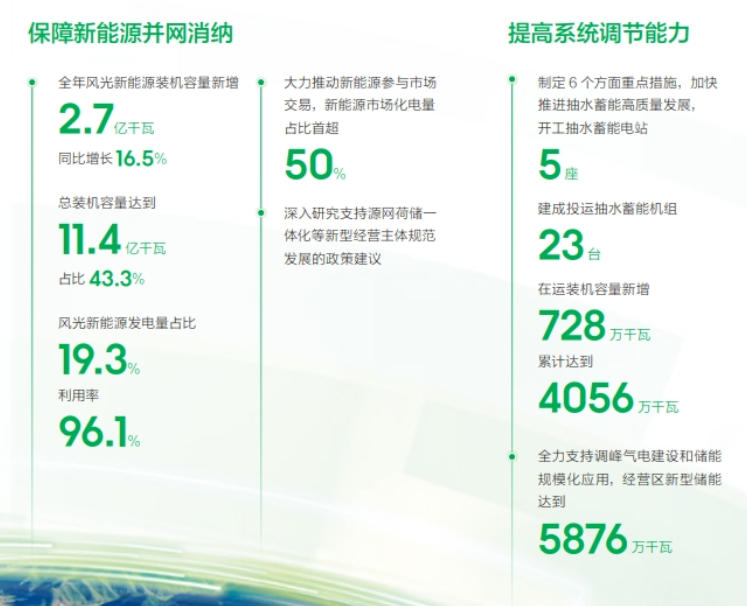 促進(jìn)新能源高質(zhì)量發(fā)展,經(jīng)營(yíng)區(qū)三批大基地項(xiàng)目累計(jì)并網(wǎng)容量1.06億千瓦;加快低壓分布式光伏柔性改造,實(shí)現(xiàn)功率柔性可調(diào)238萬(wàn)戶;全年風(fēng)光新能源裝機(jī)容量新增2.7億千瓦,同比增長(zhǎng)16.5%;風(fēng)光新能源發(fā)電量占比19.3%,利用率96.1%;開(kāi)工抽水蓄能電站5座,建成投運(yùn)抽水蓄能機(jī)組23臺(tái),在運(yùn)裝機(jī)容量累計(jì)達(dá)到4056萬(wàn)千瓦;經(jīng)營(yíng)區(qū)新型儲(chǔ)能達(dá)到5876萬(wàn)千瓦。