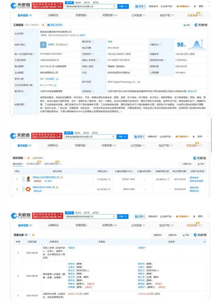 天眼查App顯示,近日,國家電投集團(tuán)數(shù)字科技有限公司發(fā)生工商變更,何聯(lián)會(huì)卸任法定代表人、董事長(zhǎng),由朱曉東接任,同時(shí)注冊(cè)資本由約9.49億人民幣增至約15.57億人民幣。