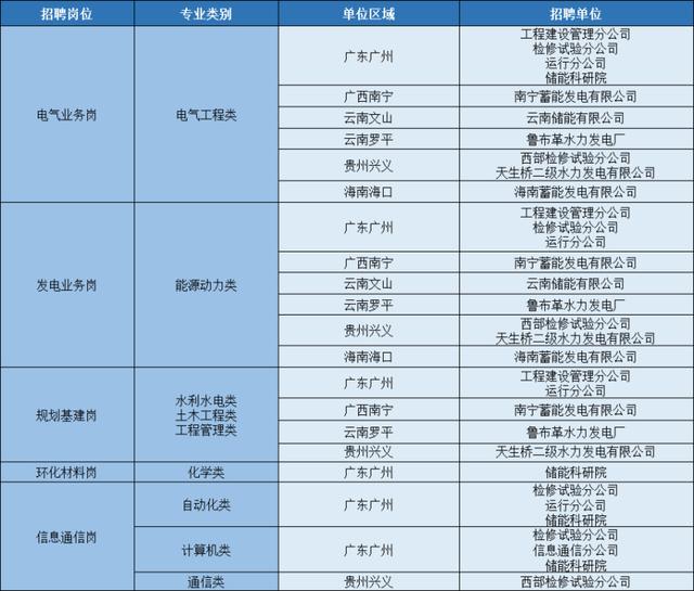 招聘單位涵蓋廣東、廣西、云南、貴州、海南五省。招聘崗位包括電氣業(yè)務崗、發(fā)電業(yè)務崗、規(guī)劃基建崗、環(huán)化材料崗、信息通信崗。具體要求如下