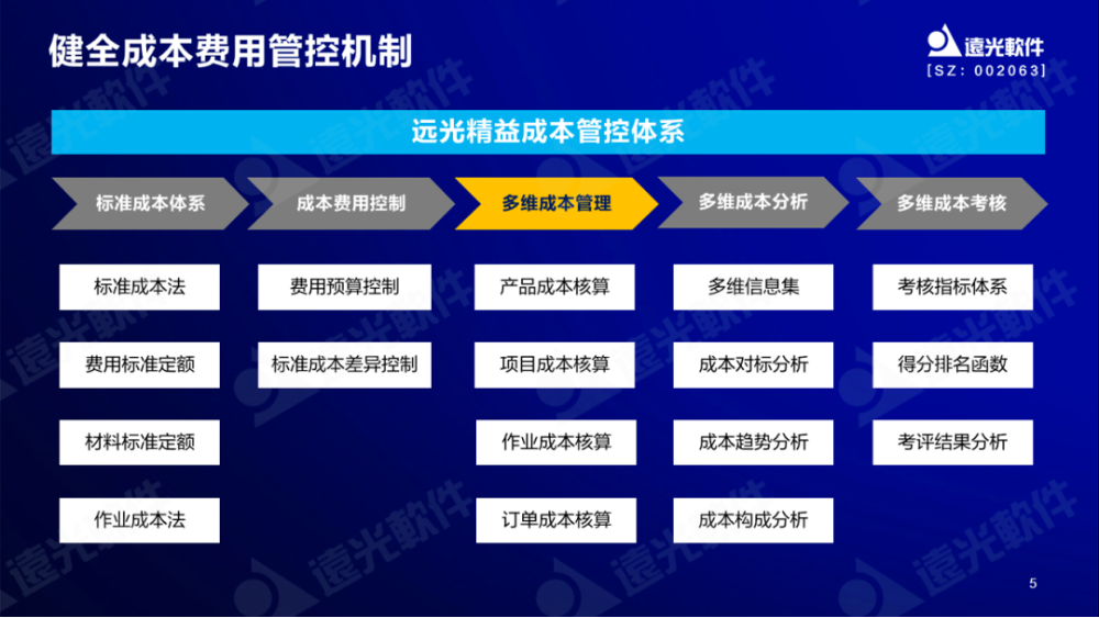 結(jié)合《指導(dǎo)意見》內(nèi)容,谷勇成介紹了遠(yuǎn)光精益成本管控體系的產(chǎn)品理念。他指出,遠(yuǎn)光精益成本管控體系主要包括“標(biāo)準(zhǔn)成本體系、成本費(fèi)用控制、多維成本管理、成本分析及成本考核”五大方面,和國(guó)資委的《指導(dǎo)意見》要求高度匹配。通過歷史成本、市場(chǎng)價(jià)格等參考信息建立企業(yè)標(biāo)準(zhǔn)成本體系,構(gòu)建成本預(yù)測(cè)/決策模型;通過成本與費(fèi)用控制,實(shí)現(xiàn)對(duì)“料、工、費(fèi)”發(fā)生過程的全面管控;通過多維成本管理與目標(biāo)成本管理結(jié)合,進(jìn)行多維度組合成本歸集、分?jǐn)偱c結(jié)轉(zhuǎn),得出實(shí)際成本以與目標(biāo)(計(jì)劃)成本作比較和分析,同時(shí)引入同業(yè)對(duì)標(biāo)或國(guó)際對(duì)標(biāo),尋找成本差異及原因;通過標(biāo)準(zhǔn)成本體系及成本定額標(biāo)準(zhǔn)(標(biāo)準(zhǔn)單價(jià)*標(biāo)準(zhǔn)業(yè)務(wù)量)的制訂,結(jié)合預(yù)算管理中的控制功能,對(duì)各項(xiàng)費(fèi)用性開支和非生產(chǎn)性支出進(jìn)行嚴(yán)格控制,以聚焦主業(yè)生產(chǎn),提高質(zhì)效;通過考評(píng)管理體系、考評(píng)指標(biāo)體系、考評(píng)計(jì)算函數(shù)、得分計(jì)算及排名分析等功能,以實(shí)現(xiàn)組織、員工、成本對(duì)象等不同維度的考核評(píng)價(jià),以激發(fā)企業(yè)和員工活力。