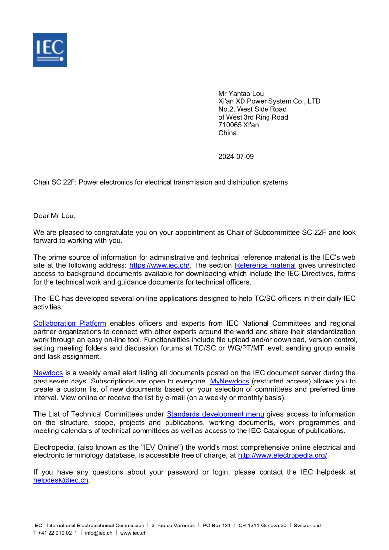 中國電氣裝備代表當(dāng)選國際電工委員會(IEC )TC22 SC22F主席