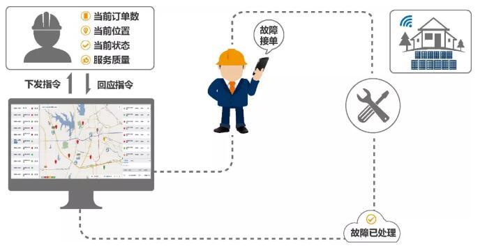 運維方面,從成本角度考慮,村級扶貧電站不適合派人長期駐守運維,故障的及時發(fā)現(xiàn)、分析、解決需要制定靈活高效的運維方案。光伏行業(yè)先進企業(yè)通過現(xiàn)代化物聯(lián)網(wǎng)技術(shù)、人工智能及大數(shù)據(jù)分析技術(shù),為光伏電站打造智慧大腦,實現(xiàn)電站實時監(jiān)測、智能分析和診斷、快速定位。此次示例設計方案中將電站接入智慧能源扶貧平臺,在實現(xiàn)以上功能基礎之外,增加智能派單功能,實現(xiàn)及時消缺,使得村級扶貧電站的運維更加高效。