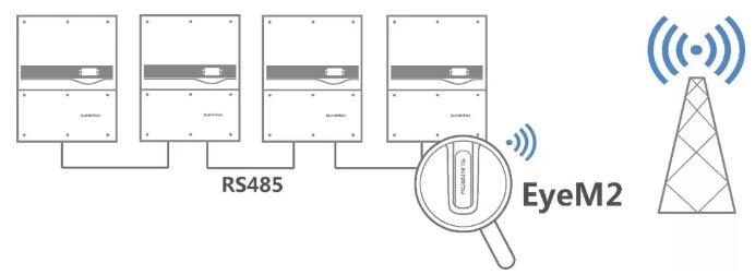 逆變器標配RS485通訊接口,通過通訊線纜“手拉手”式連接,只需給其中一臺逆變器配置EyeM2無線通訊模塊,由其集中上傳所有數(shù)據(jù),不僅讓組網(wǎng)更簡單,還能夠節(jié)省通訊模塊及流量費用;同時通過陽光云APP掃描通訊模塊二維碼接入智慧能源管理平臺,一鍵掃碼建站,大大提升建站效率。