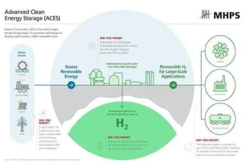 MHPS還通過猶他州高級清潔能源存儲(ACES)項(xiàng)目,開發(fā)了網(wǎng)格化大規(guī)模的可再生氫生產(chǎn)和存儲技術(shù)。ACES項(xiàng)目使用可再生能源通過電解生產(chǎn)氫氣。氫氣將在現(xiàn)場的地下鹽穴實(shí)現(xiàn)跨季節(jié)存儲,并供給墨西哥灣沿岸的煉油廠。當(dāng)風(fēng)、光可再生能源發(fā)電受限時(shí),存儲的可再生氫可以直接發(fā)電。