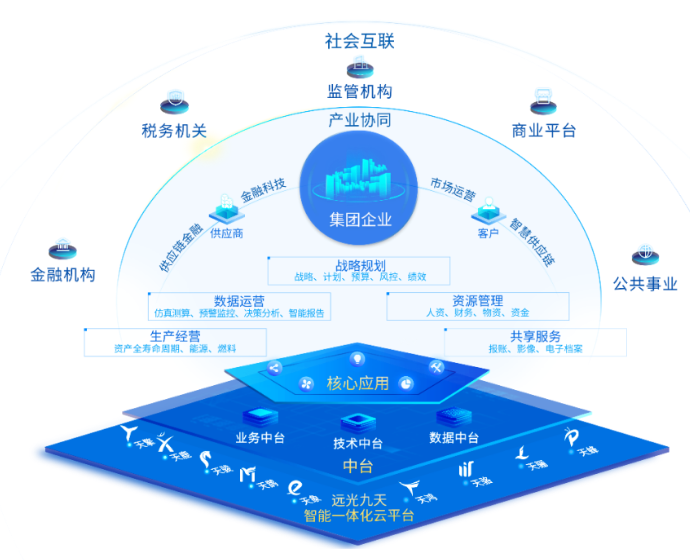在傳統(tǒng)的企業(yè)內(nèi)部人力、物力、財力等資源要素管理基礎(chǔ)上,擴展戰(zhàn)略規(guī)劃、生產(chǎn)經(jīng)營、共享服務(wù)、數(shù)據(jù)運營等四個領(lǐng)域的核心應(yīng)用,將先進數(shù)字技術(shù)與企業(yè)資源管理、業(yè)務(wù)運營深度融合,通過一套系統(tǒng)同時滿足企業(yè)不同層級、不同業(yè)務(wù)領(lǐng)域的數(shù)字化需求。同時,依托可擴展的平臺能力,共享基于先進業(yè)務(wù)實踐沉淀的新業(yè)務(wù)、新理念管理模型,彈性支撐業(yè)務(wù)發(fā)展,為全業(yè)務(wù)進行賦能。