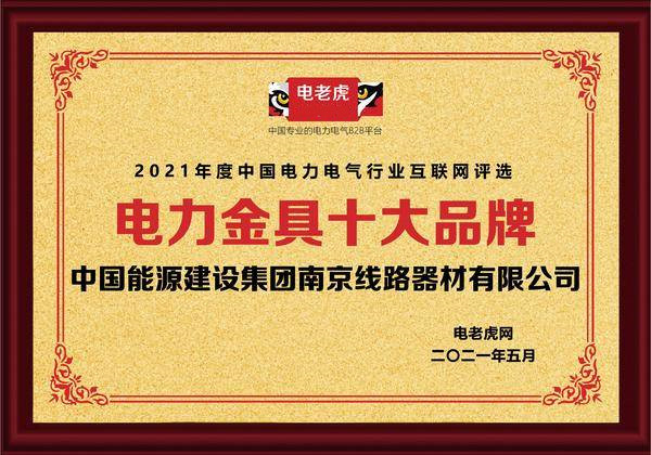 近日,中國能源建設(shè)集團(tuán)南京線路器材有限公司參與了2021年度中國電力電氣行業(yè)“十大品牌”系列評選活動,榮獲“電力金具十大品牌”稱號。