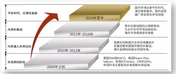回顧逆變器的發(fā)展歷史,2003年陽光電源推出中國首臺(tái)擁有自主知識(shí)產(chǎn)權(quán)的逆變器。2012年全球出貨量前十中只有陽光電源一家中國企業(yè)。2015年以來,華為、陽光電源和SMA的出貨量前三地位穩(wěn)定,而行業(yè)腰部企業(yè)市場(chǎng)份額接近,競(jìng)爭(zhēng)更為激烈。在激烈的角逐中,中國逆變器企業(yè)逐漸崛起。如今,陽光電源、華為等品牌逆變器穩(wěn)扎穩(wěn)打,在國際站穩(wěn)腳跟。歷經(jīng)激烈競(jìng)爭(zhēng)、行業(yè)迭代,我國逆變器企業(yè)實(shí)現(xiàn)從無到有、從有到強(qiáng)的強(qiáng)勢(shì)蛻變。
