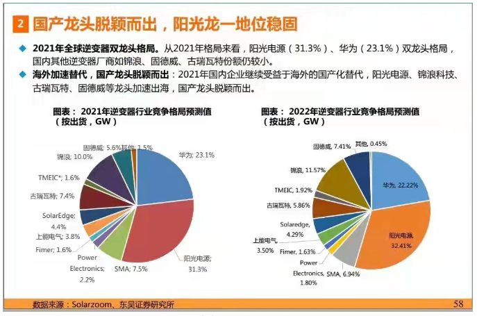 經(jīng)過多年大浪淘沙式的行業(yè)洗牌后,馬太效應(yīng)凸顯,2021年全球逆變器呈現(xiàn)雙龍頭格局。從2021年格局來看,陽光電源占據(jù)31.3%的市場(chǎng),而華為占據(jù)23.1%。